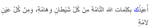 "Aku berlindung kepada Allah untukmu berdua dengan kalimat-kalimat Allah yang sempurna, dari segala setan, binatang yang berbisa dan pandangan mata yang jahat."
